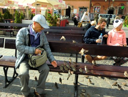 ワルシャワ市街の第2次大戦以前と終戦時の対照写真が展示されています。 旧市街市場広場では人懐こいスズメ達と交流。