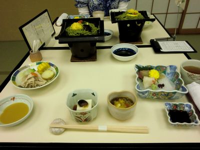 有名旅館の期待の夕食、画像のほかに「茶碗蒸し」、「ふぐ刺し」の小皿と「タイのあら煮」