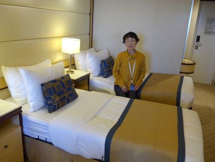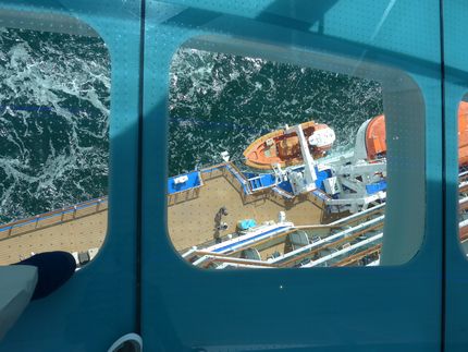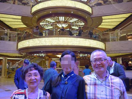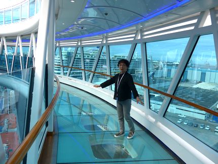 今回は航海が長いので、船室は張り込んでバス付きジュニアスイートとしました。 プリンセスラインの良い所は、コインランドリーがあるため替え下着の心配がありません。 (3日目)終日航海![]() ![]() 終日航海日はのんびり船内散策、売り物の空中回廊を歩いてみました。 足元を海面が流れていくのを見ると、空を飛んでいるような不思議な気分です。