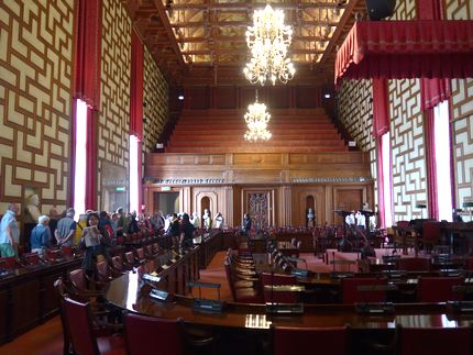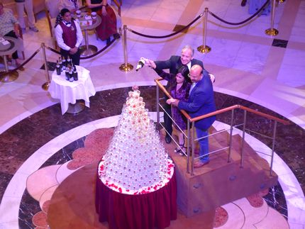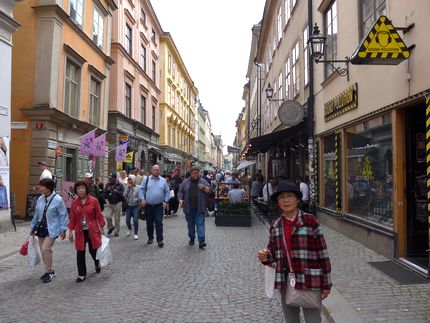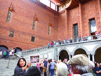 朝食は和定食をチャレンジしてみました、今までのクルーズ和食では一番良かったです。 夜はプリンセスライン恒例のシャンパンタワーイベントです。 (4日目)ストックホルム![]() ![]() 船は1日航海をしてスエーデンのニーネスハムン港に入港、バスでストックホルムに向かいます。 フィヤールガータン展望台からガムラスタンのさわりを見て、市庁舎へ。