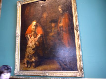 レンブラントの「放蕩息子の帰還」、ロシア人ガイドが気に入ってるらしく延々と説明してくれました。 懐かしい美術館前の広場と記念柱、若い人たちがパフォーマンスをしていました。