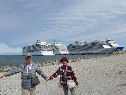 4年前と同じチョコレートを買って、懐かしい牛さんと記念写真を撮り港へ。 港に豪華客船が4隻並んでいるのは壮観でした。 (9日目)終日航海![]() ![]()
