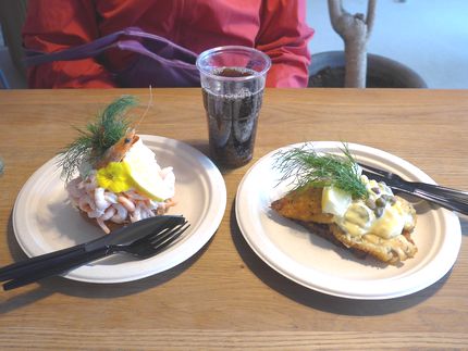 チボリ公園そばで、エビと焼魚のスモーブローにチャレンジ。